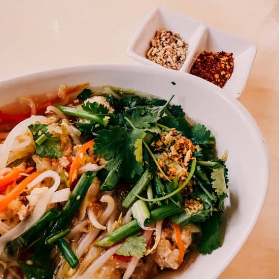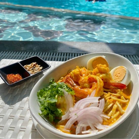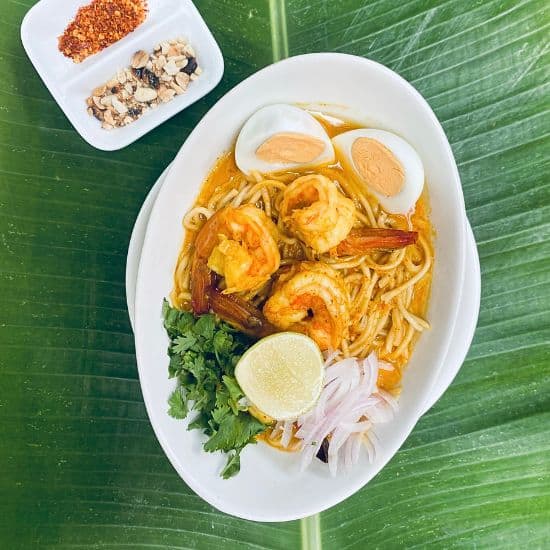 Burmese noodles with garlic-infused chicken fat and stired with aromatic poached chicken and crispy garlic