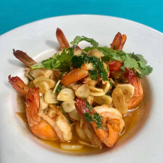 Prawns slightly stir fried in hot butter garlic and white wine, served with rice
