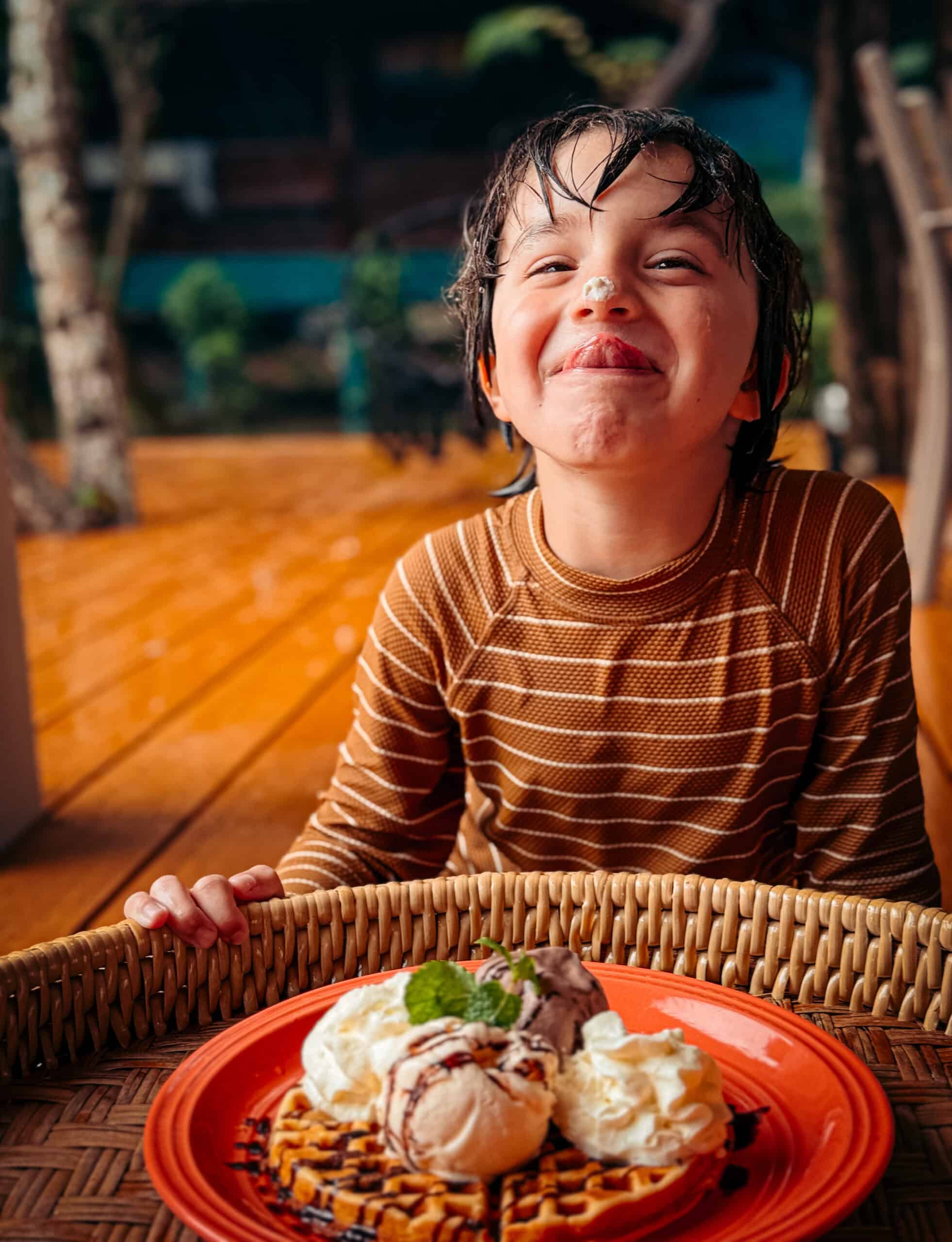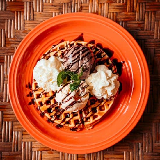 Homemade waffle with two scoops of your favorite ice cream and whipped cream